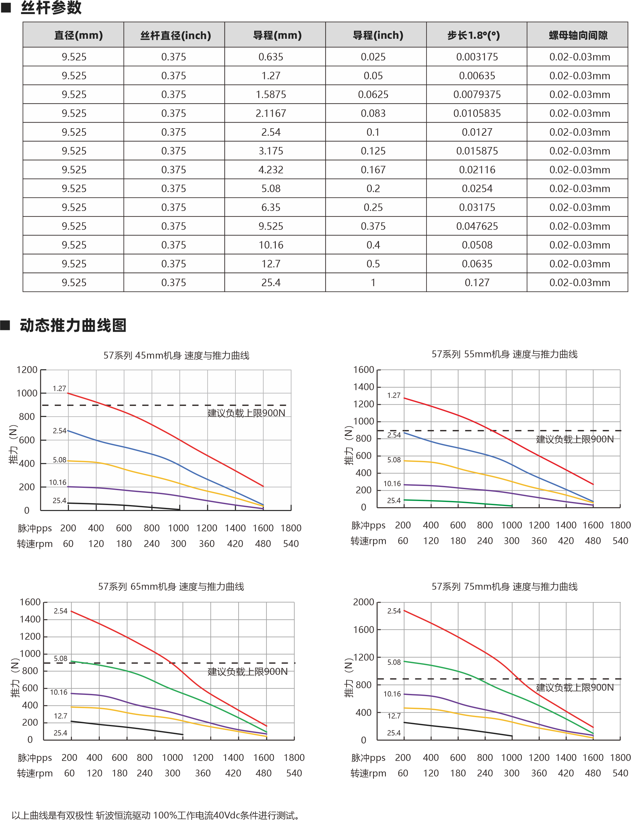 57系列絲桿電機 57系列絲桿電機 動態(tài)推力曲線圖 外形圖  相數(shù) 步距角精度 IP等級  認證 絕緣等級 運行環(huán)境溫度 2 ±5% 40 RoHS CE ISO9001 B(130℃) -20℃~ +50℃ 螺母類型 電機參數(shù) 57 45mm 0.7 3A 0.75Ω 0.72mH 2.25V 3A 0.92Ω 4.5mH 2.76V 4A 0.78Ω 3.3mH 3.12V 電機類型 機身L(mm) 保持力矩(N.m) 額定電流(A) 電阻(Ω) 額定電感(mH) 額定電壓(V) 絲桿參數(shù) 0.375 0.635 0.025 0.003175 9.525 0.02-0.03mm 0.375 1.27 0.05 0.00635 9.525 0.02-0.03mm 0.375 1.5875 0.0625 0.0079375 9.525 0.02-0.03mm 0.375 2.1167 0.083 0.0105835 9.525 0.02-0.03mm 0.375 2.54 0.1 0.0127 9.525 0.02-0.03mm 0.375 3.175 0.125 0.015875 9.525 0.02-0.03mm 0.375 4.232 0.167 0.02116 9.525 0.02-0.03mm 0.375 5.08 0.2 0.0254 9.525 0.02-0.03mm 0.375 6.35 0.25 0.03175 9.525 0.02-0.03mm 0.375 9.525 0.375 0.047625 9.525 0.02-0.03mm 0.375 10.16 0.4 0.0508 9.525 0.02-0.03mm 0.375 12.7 0.5 0.0635 9.525 0.02-0.03mm 0.375 25.4 1 0.127 9.525 0.02-0.03mm 絲桿直徑(inch) 直徑(mm) 導程(mm) 導程(inch) 步長1.8°(°) 螺母軸向間隙 55mm 0.9 65mm 1.5 75mm 1.8 4A 0.95Ω 4.5mH 3.8V 4A 0.97Ω 7mH 3.88V 5A 0.7Ω 3.2mH 3.5V 2.2 84mm(貫穿除外) 100mm(貫穿除外) 2.5 25.4 5 3-Φ3.5 三角形螺母 外部驅動式電機 貫通軸式電機 57系列 45mm機身 速度與推力曲線 57系列 55mm機身 速度與推力曲線 脈沖pps 轉速rpm 200 60 400 120 600 180 800 240 1000 300 1200 360 1400 420 1600 480 1800 540 脈沖pps 轉速rpm 200 60 400 120 600 180 800 240 1000 300 1200 360 1400 420 1600 480 1800 540 1200 1000 800 600 400 200 0 1600 1400 1200 1000 800 600 400 200 0 1.27 2.54 5.08 10.16 25.4 1.27 2.54 5.08 10.16 25.4 1.5 Lx L 高柔電纜線 5 56.2 47.14 M6X1 Lx L 高柔電纜線 1.5 12 5 7 3- 5.1 28.6 40 圓形螺母 消隙螺母 57系列 75mm機身 速度與推力曲線 脈沖pps 轉速rpm 200 60 400 120 600 180 800 240 1000 300 1200 360 1400 420 1600 480 1800 540 2000 1600 1200 800 400 0 2.54 5.08 10.16 12.7 25.4 57系列 65mm機身 速度與推力曲線 脈沖pps 轉速rpm 200 60 400 120 600 180 800 240 1000 300 1200 360 1400 420 1600 480 1800 540 1600 1400 1200 1000 800 600 400 200 0 2.54 5.08 10.16 12.7 25.4 建議負載上限900N 建議負載上限900N 建議負載上限900N 建議負載上限900N 步進直線傳動產(chǎn)品制造商 Linear stepper motor provider 步進直線傳動產(chǎn)品制造商 Linear stepper motor provider 以上曲線是有雙極性 斬波恒流驅動 100%工作電流40Vdc條件進行測試。
