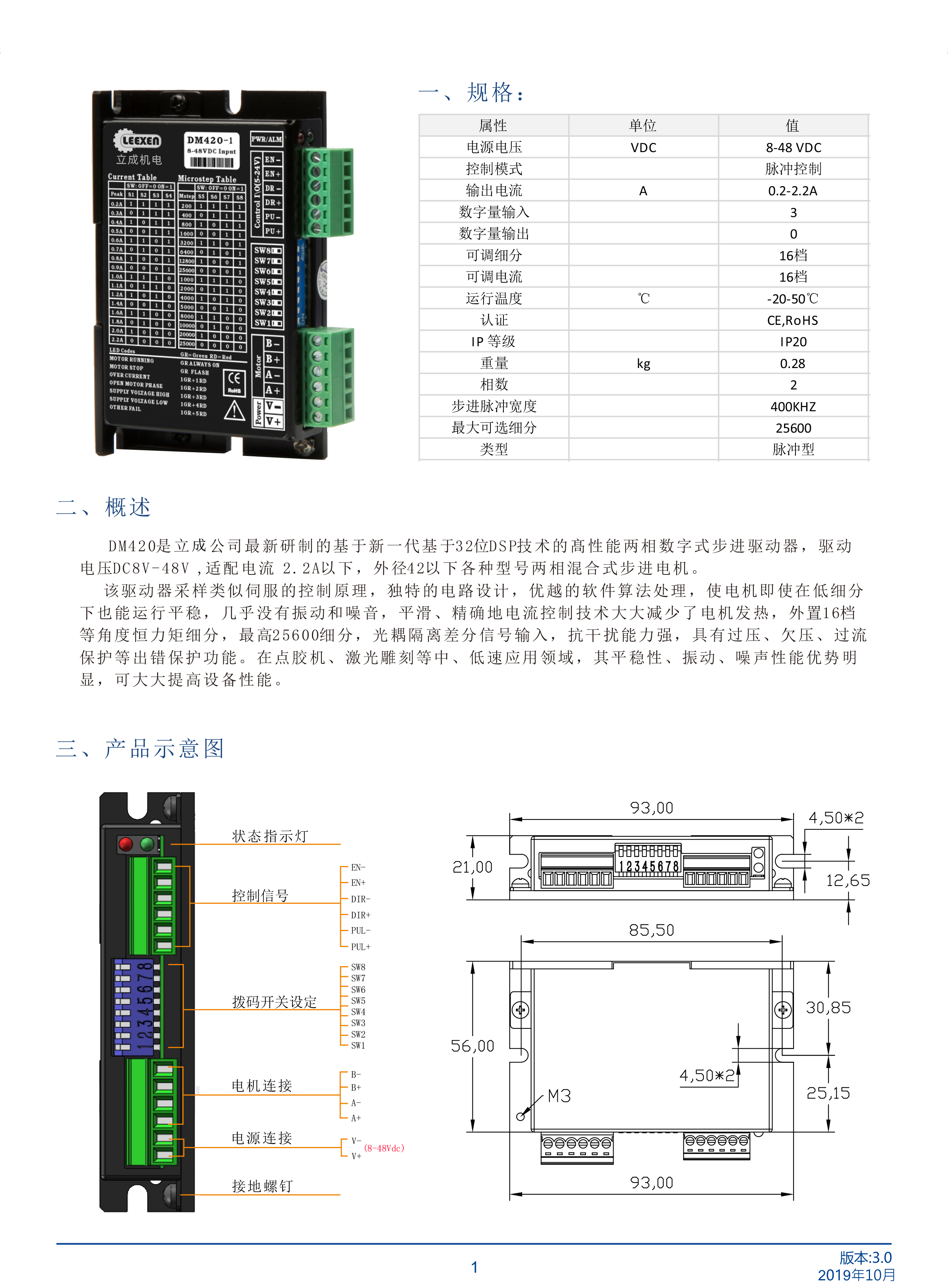 DM420是立成公司最新研制的基于新一代基于32位DSP技術(shù)的高性能兩相數(shù)字式步進(jìn)驅(qū)動(dòng)器,驅(qū)動(dòng)電壓DC8V-48V適配電流 2.2A以下,外徑42以下各種型號(hào)兩相混合式步進(jìn)電機(jī)。該驅(qū)動(dòng)器采樣類似伺服的控制原理,獨(dú)特的電路設(shè)計(jì),優(yōu)越的軟件算法處理,使電機(jī)即使在低細(xì)分下也能運(yùn)行平穩(wěn),幾乎沒有振動(dòng)和噪音,平滑、精確地電流控制技術(shù)大大減少了電機(jī)發(fā)熱,外置16檔等角度恒力矩細(xì)分,最高25600細(xì)分,光耦隔離差分信號(hào)輸入,抗干擾能力強(qiáng),具有過壓、欠壓、過流保護(hù)等出錯(cuò)保護(hù)功能。在點(diǎn)膠機(jī)、激光雕刻等中、低速應(yīng)用領(lǐng)域,其平穩(wěn)性、振動(dòng)、噪聲性能優(yōu)勢(shì)明顯,可大大提高設(shè)備性能。