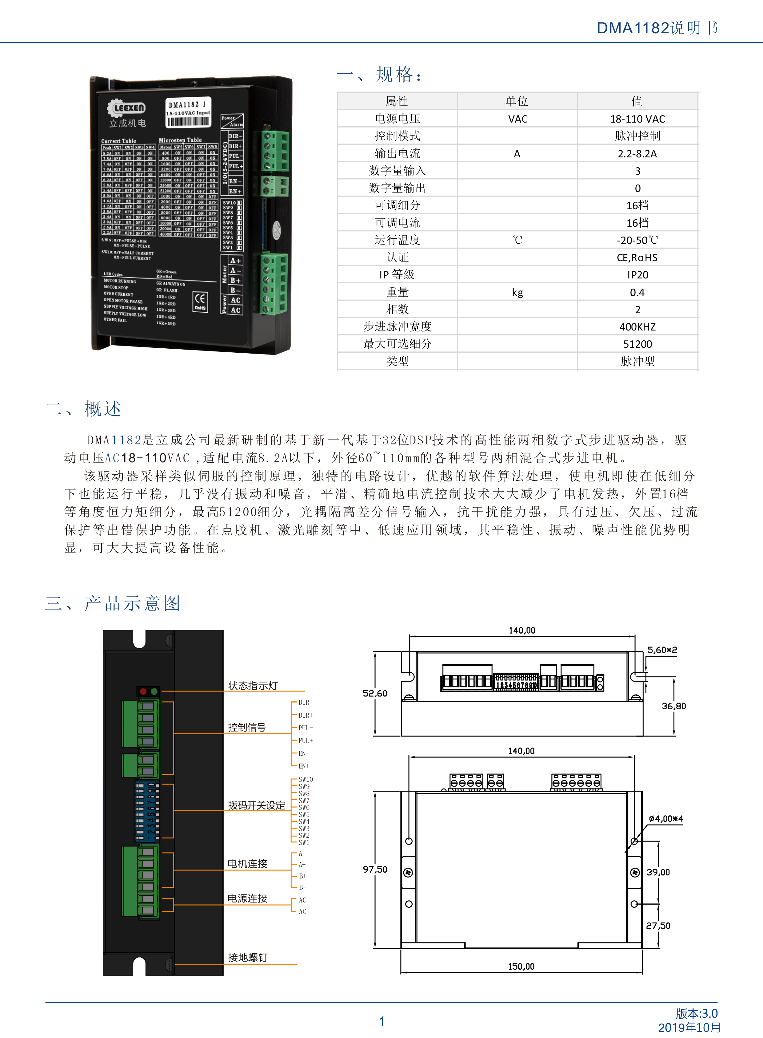 DMA1182是立成公司最新研制的基于新一代基于32位DSP技術(shù)的高性能兩相數(shù)字式步進(jìn)驅(qū)動器,驅(qū)動電壓AC18-110VAC,適配電流8.2A以下,外徑60 110mm的各種型號兩相混合式步進(jìn)電機(jī)。該驅(qū)動器采樣類似伺服的控制原理,獨(dú)特的電路設(shè)計,優(yōu)越的軟件算法處理,使電機(jī)即使在低細(xì)分下也能運(yùn)行平穩(wěn),幾乎沒有振動和噪音,平滑、精確地電流控制技術(shù)大大減少了電機(jī)發(fā)熱,外置16檔等角度恒力矩細(xì)分,最高51200細(xì)分,光耦隔離差分信號輸入,抗干擾能力強(qiáng),具有過壓、欠壓、過流保護(hù)等出錯保護(hù)功能。在點(diǎn)膠機(jī)、激光雕刻等中、低速應(yīng)用領(lǐng)域,其平穩(wěn)性、振動、噪聲性能優(yōu)勢明顯,可大大提高設(shè)備性能。